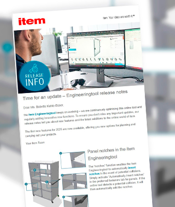 The item online world is continuously being developed and expanded with new, powerful functions. With the release information, you will receive all important innovations and feature updates directly by e-mail. This allows you to take advantage of the latest improvements immediately, work with state-of-the-art technology and implement your projects more efficiently, precisely and quickly in our online tools.